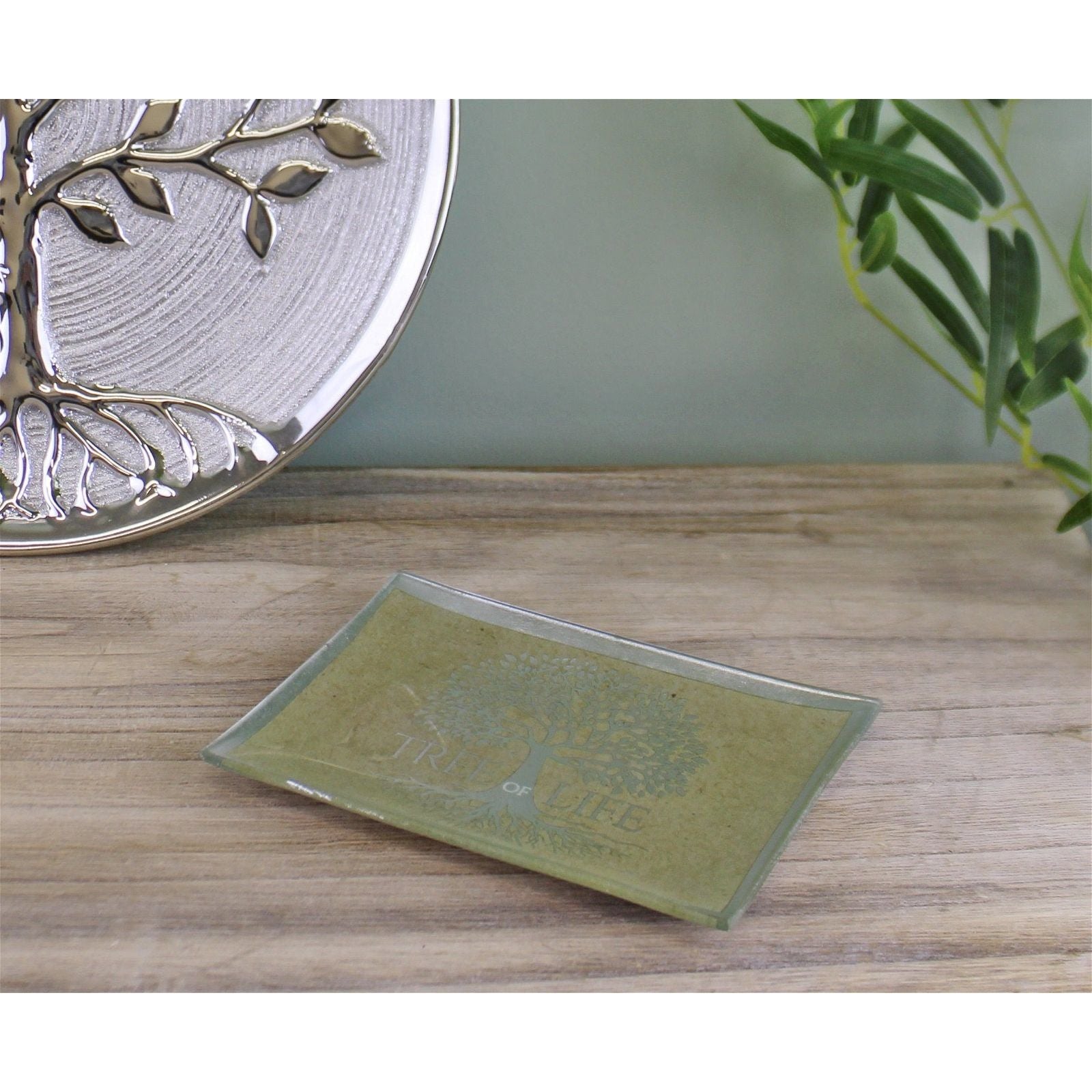 This glass trinket dish is part of our popular Tree Of Life range and features a silver Tree Of Life. Made of 100% Glass. Measurements: Width 10cm x Depth 1cm x Length 14.5cm SKU: TL0063