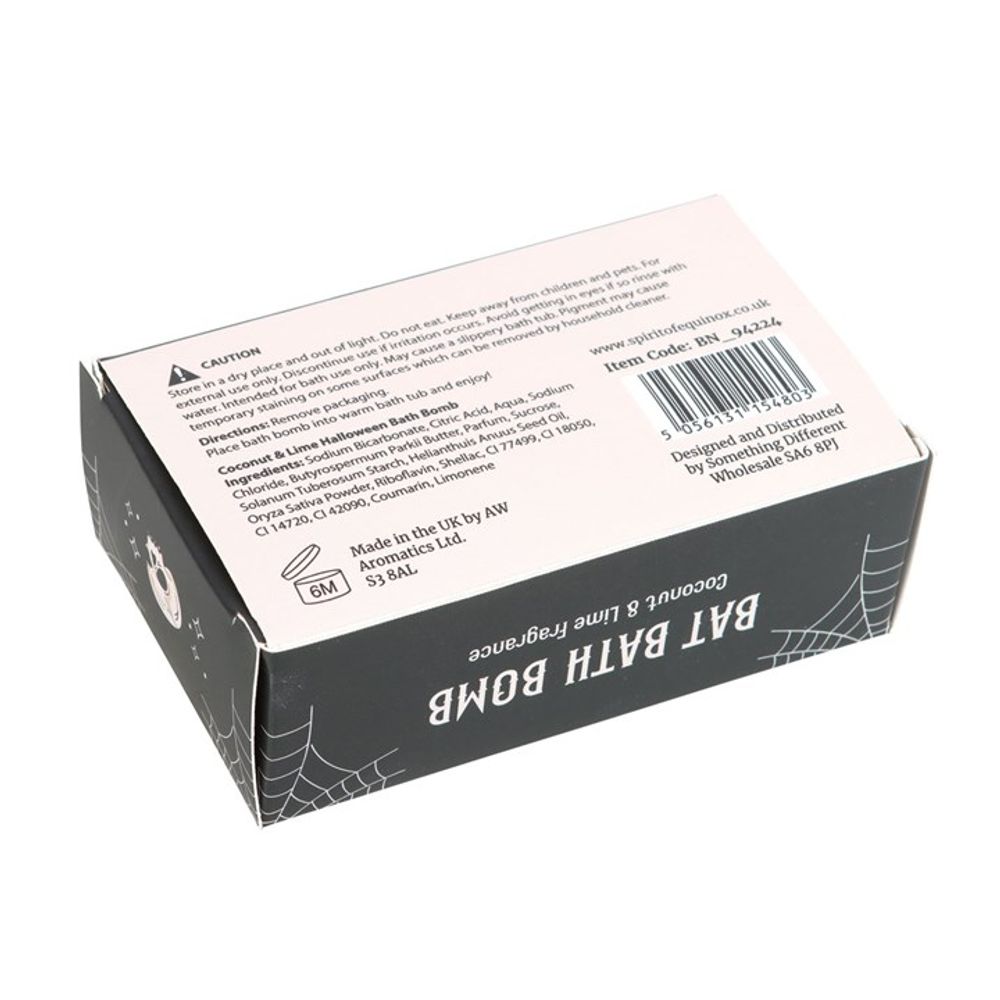 Unwind after a long day of haunting with this spooky bath bomb. Shaped like a bat, this fun fizzer is sure to make your next bath deadly relaxing. Coconut & Lime fragrance. Store in a cool, dry place.