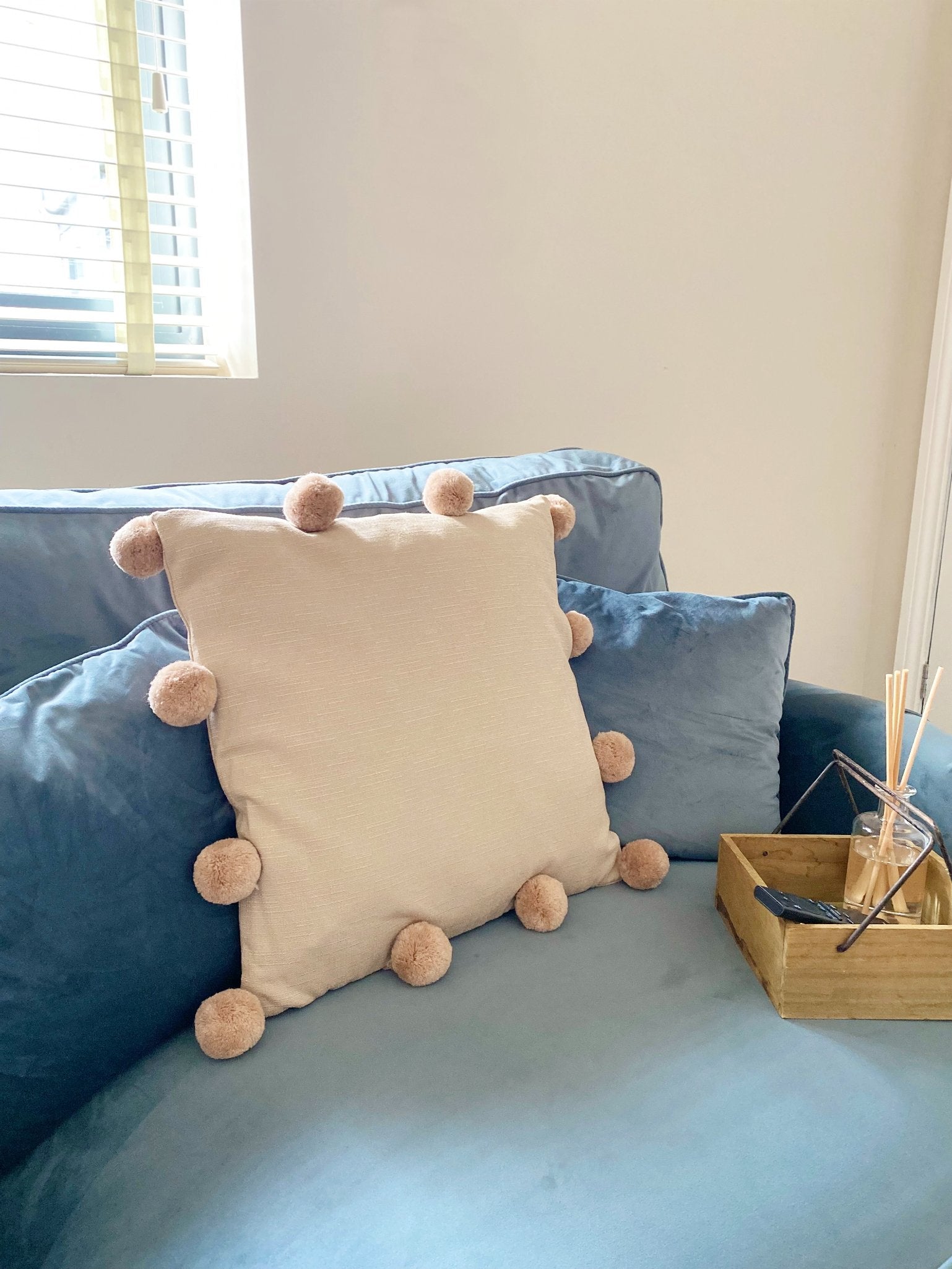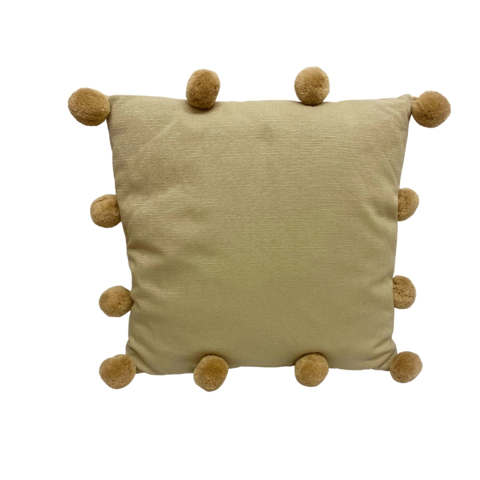 Beige square shape scatter cushion with fluffy pompoms. Add a fun touch to your sofa or chair with this modern, square shape scatter cushion. The cushion cover and insert are made from polyester and adorned with beige pompoms around all four edges. This cushion is suitable for hand washing only and features a full length zip on one side. Measurements: D3 x H45 x W45cm