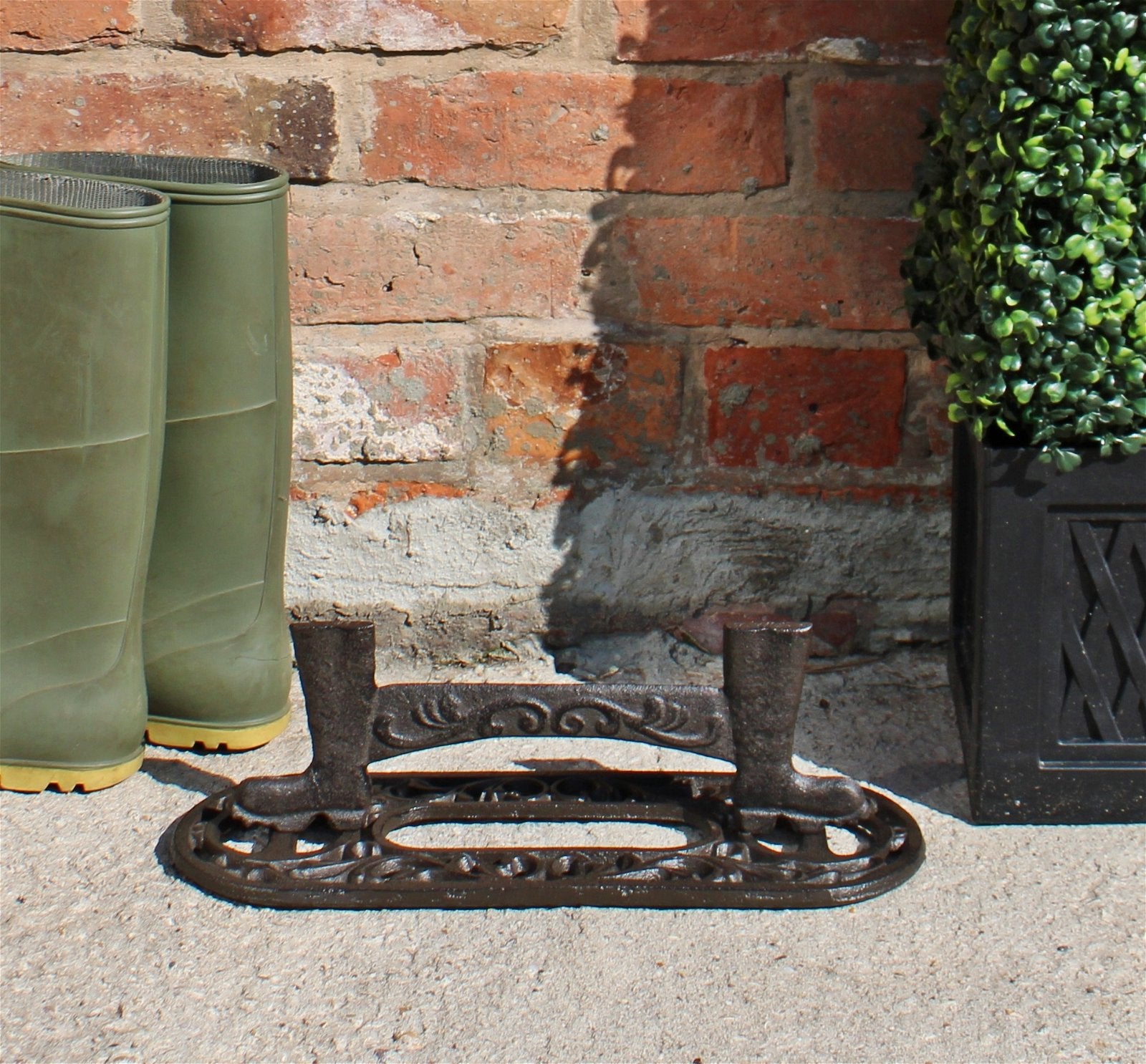 This handy boot scraper can be placed by your back door to clean muddy boots before entering the home. Featuring a scroll and wellington boot design. Ideal for ensuring dirt and mud is kept outdoors, this cast iron boot scraper is hard wearing and weather resistant. Made of Cast Iron. Measurements: 14 x 12 x 36.5cm