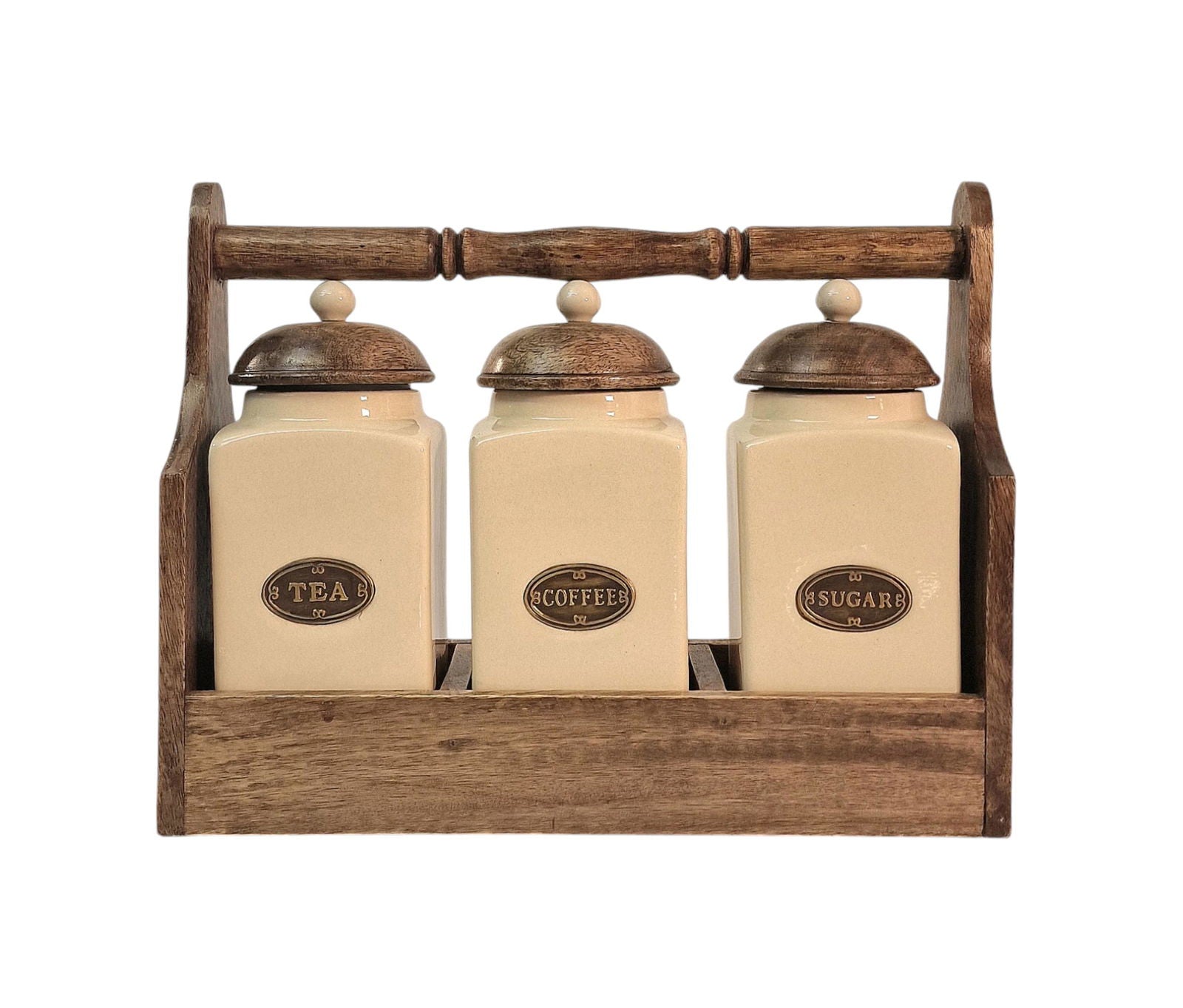 touch of vintage charm. Perfect for those who appreciate timeless, rustic style with a modern twist. A gorgeous set of Tea, Coffee and Sugar ceramic jars, housed in a solid mango wood holder. Each ceramic jar is H20.5 x D9.5 x W9 cm. Overall measurements: D12.5 x H27.5 x W35cm