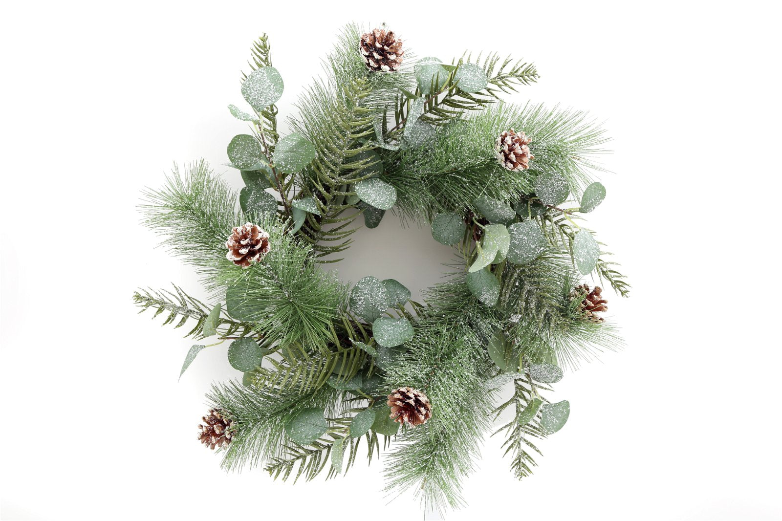 A charming round artificial eucalyptus leaf wreath with added icy pinecones. A delightful wreath to hang on your front door at Christmas time. Measurements: D12 x H50 x W50cm