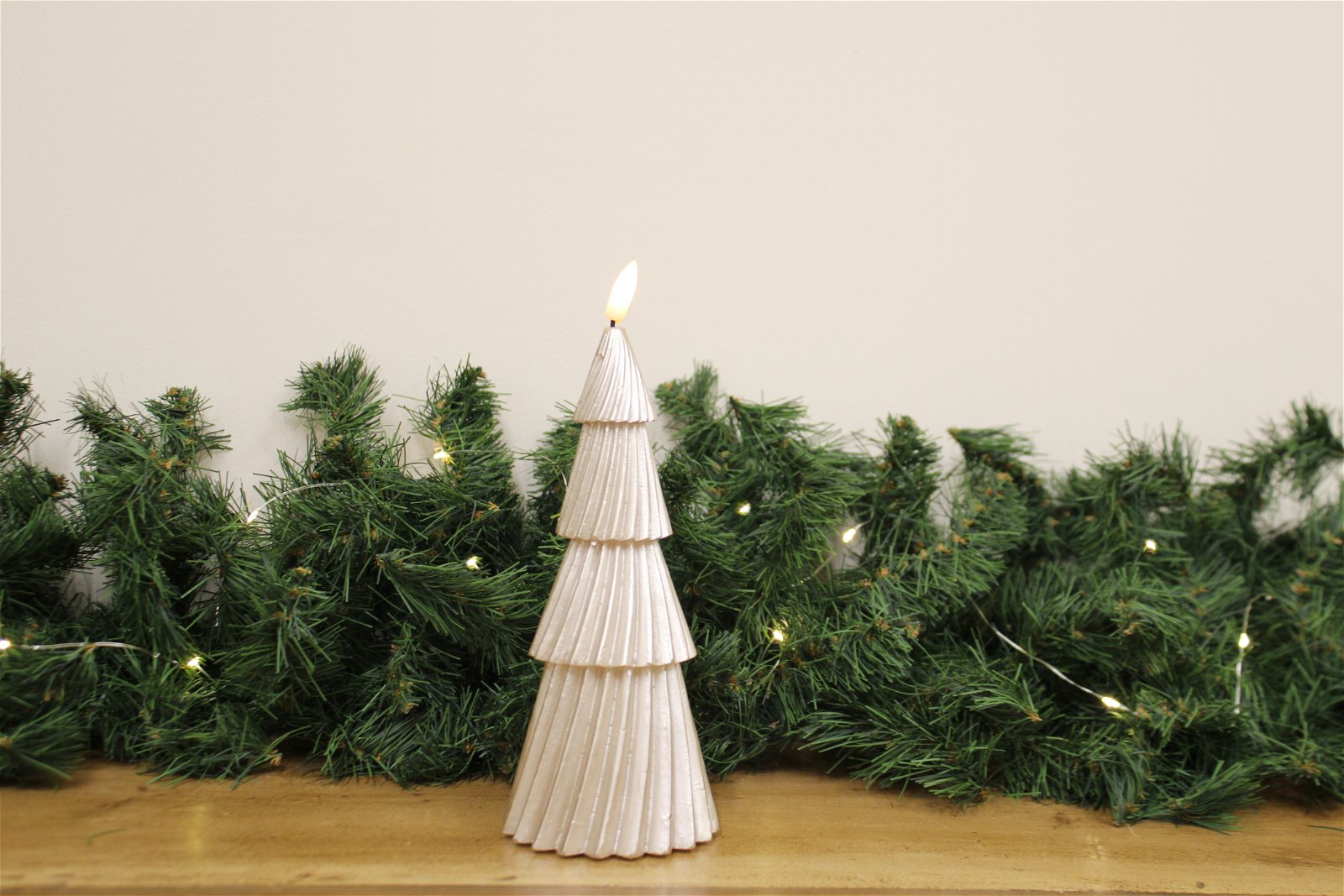Wax moulded gold Christmas tree LED candle. Requires 2 x AAA batteries. Measurements: D8.5 x H23 x W8.5cm