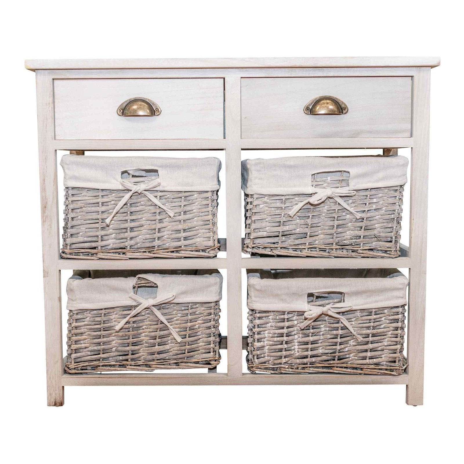 This grey wood grain effect cabinet with 2 drawers and 4 wicker baskets would look great as a side table in the hall for shoes, paperwork or even clearing up the kids toys in a playroom. The cabinets overall external dimensions are W74cm x D29.1cm x H64cm. The drawers external dimensions are W35cm x D24cm x H10.9cm and the internal dimensions are W29cm x D22.5cm x H9.2cm. The drawers have a brass handle which is W8cm x H3.5cm. There are 4 wicker baskets which have a grey cloth insert. The wicker basket external dimensions are H19cm x W30cm x 25cm and the internal dimensions are H16.5cm x W27.5cm x D22.5cm. The legs measurements are W3cm x D1.6cm x H4cm with a rubber floor protector on the base. Overall measurements: D29.1 x H64 x W74cm