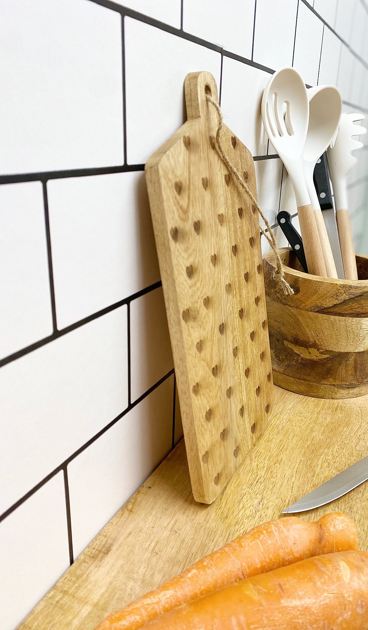 A wooden cheese board with an engraved hearts design on the front, with a jute string loop. The cheese board is 30cm in length including the handle and made from 100% Mango Wood. Measurements: D15.5 x H1 x W30cm