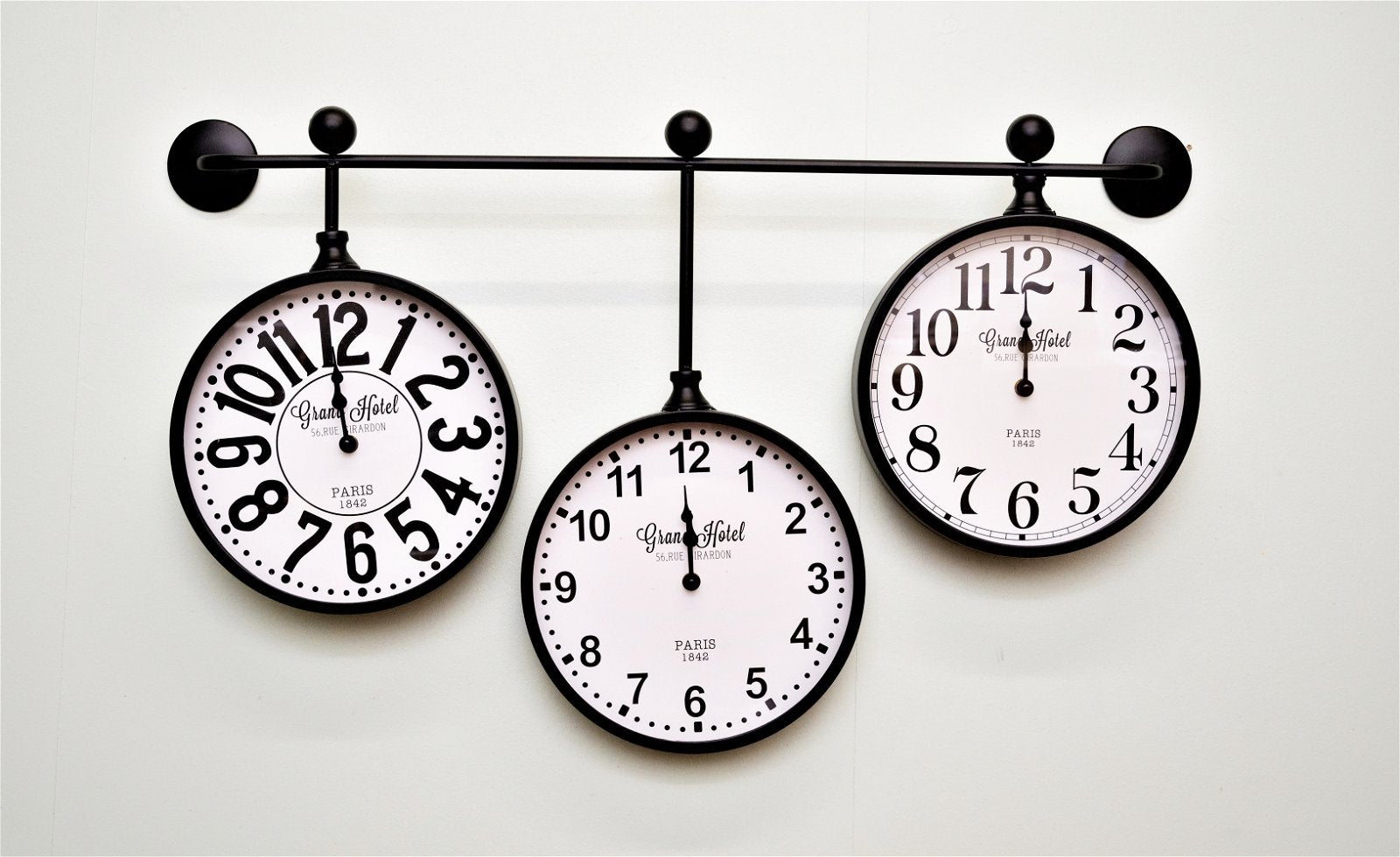 An interesting design of three clocks suspended at different levels from a black pole. The contrast in font, design and height of the clocks allows you to appreciate each clock on its own. Clock dimensions 25.5diameter. Requires 1 x AA battery that is not included. Measurements: D47 x H9 x W79.4cm SKU: CL2183