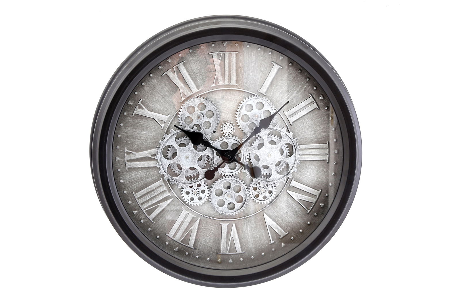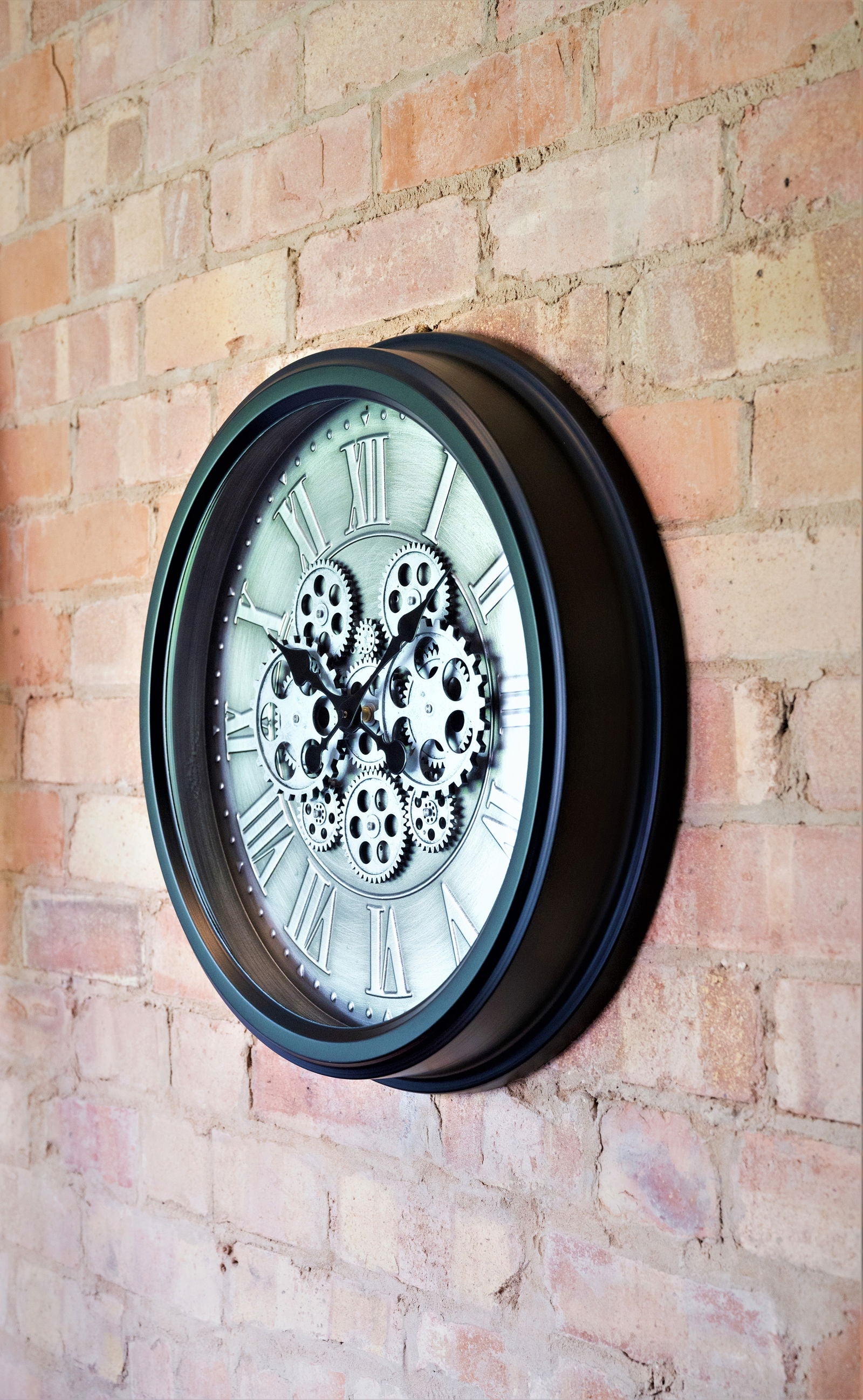 An attractive moving gear clock. The matt black surround contrasts well with the grey metallic coloured clock face. The steel grey metallic style clock face features Roman numerals. The moving gears are powered by 3 x AA batteries that are not included. The clock mechanism also requires 1 x AA battery. Overall measurements are: D9.5 x H52.5 x W52.5cm SKU: CL2149