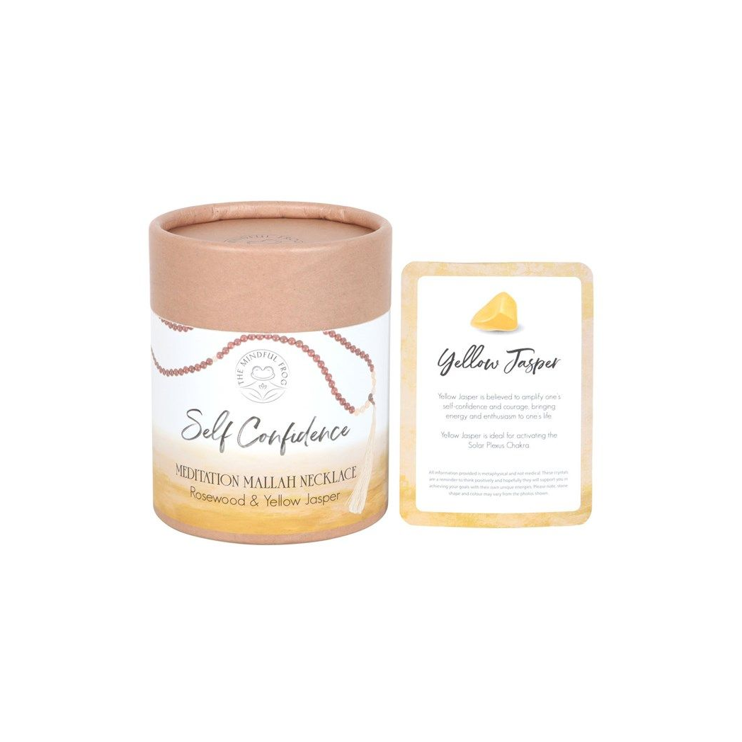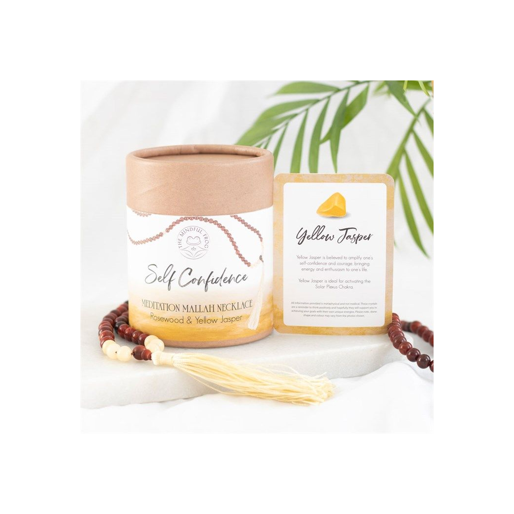 Crafted from rich, warm rosewood beads and interlaced with vibrant Yellow Jasper stones, this elegant necklace showcases 108 beads — a traditional number in Mallah necklaces symbolizing spiritual journey and mindfulness — and is finished with a decorative tassel. The Yellow Jasper, known for its association with the solar plexus chakra, is believed to amplify self-confidence and courage. It is said to attract energy and enthusiasm, empowering the wearer with a sense of boldness and assertiveness. A Mallah, or Mala, necklace is a string of beads traditionally used in meditation and prayer in various spiritual practices including Buddhism and Hinduism. Each bead represents a repetition of a mantra or prayer, aiding in focus and spiritual contemplation. To use simply hold the necklace in one hand and move from bead to bead whilst focusing on mindful breathing and repeating an intention. The necklace can be worn throughout the day as a reminder of these intentions. Each Mallah Necklace is presented in a beautifully designed box, accompanied by a corresponding information card, making it an ideal and thoughtful gift for a loved one seeking to boost their self-assurance and personal power.