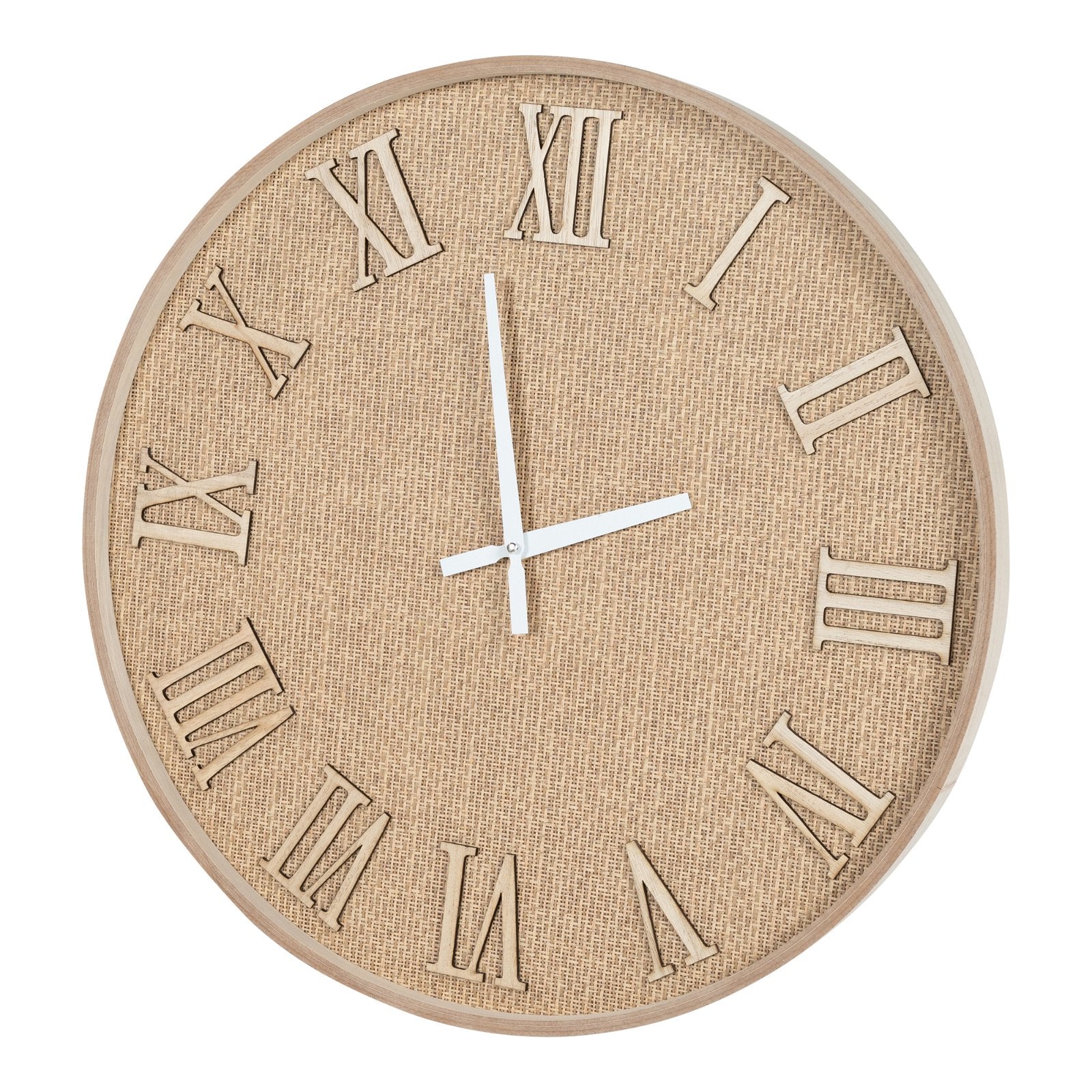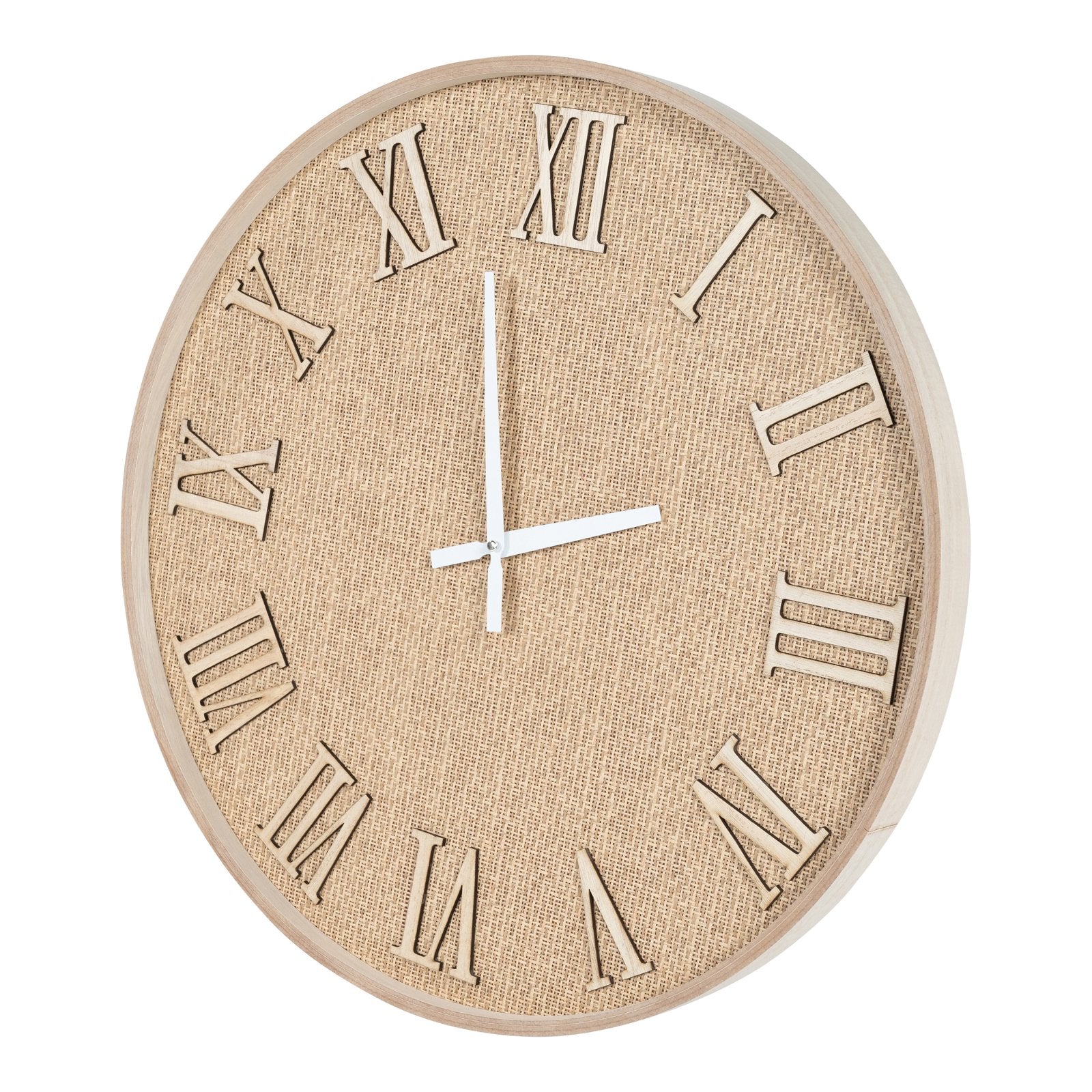 This hessian clock would add a natural feel to any home. The contrasting white hands are very clear and can be seen easily when the clock is hung on the wall. The clock diameter is 50cm with a wooden hessian face and white hands. Measurements: D4.5 x H50 x W50cm SKU: SR0085