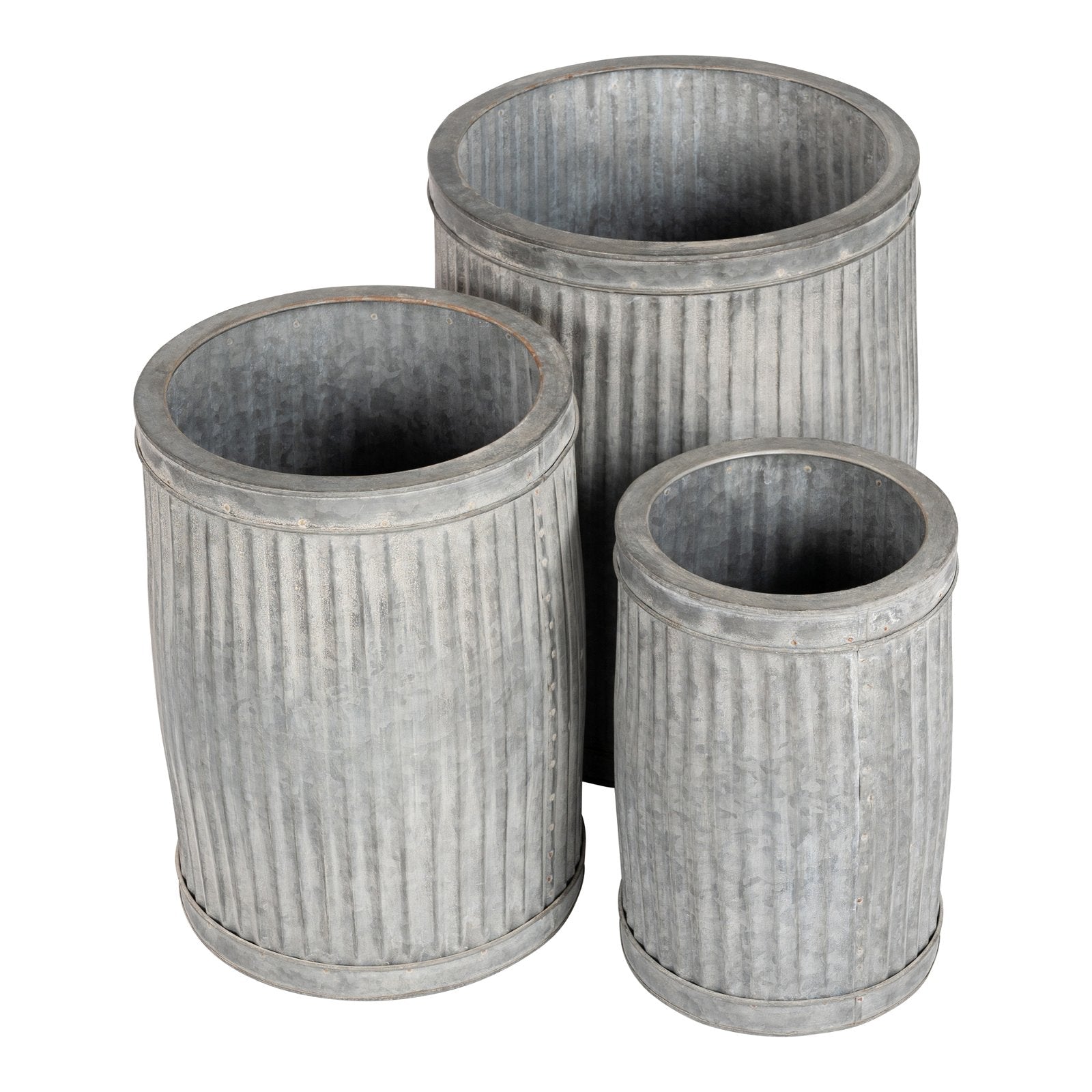 This set of 3 tin barrel planters have a rustic feel and would look good inside or outside of the home. The large barrel measures 28.5cm in diameter, the base is 33cm and the depth is 41cm. The medium barrel measures 22.5cm in diameter, with a base of 26.5cm and a depth of 37cm. The small barrels diameter is 16.5cm, with a base of 20.5cm and a depth of 30.5cm. Overall measurements are: D35 x H41 x W35cm SKU: PS0161