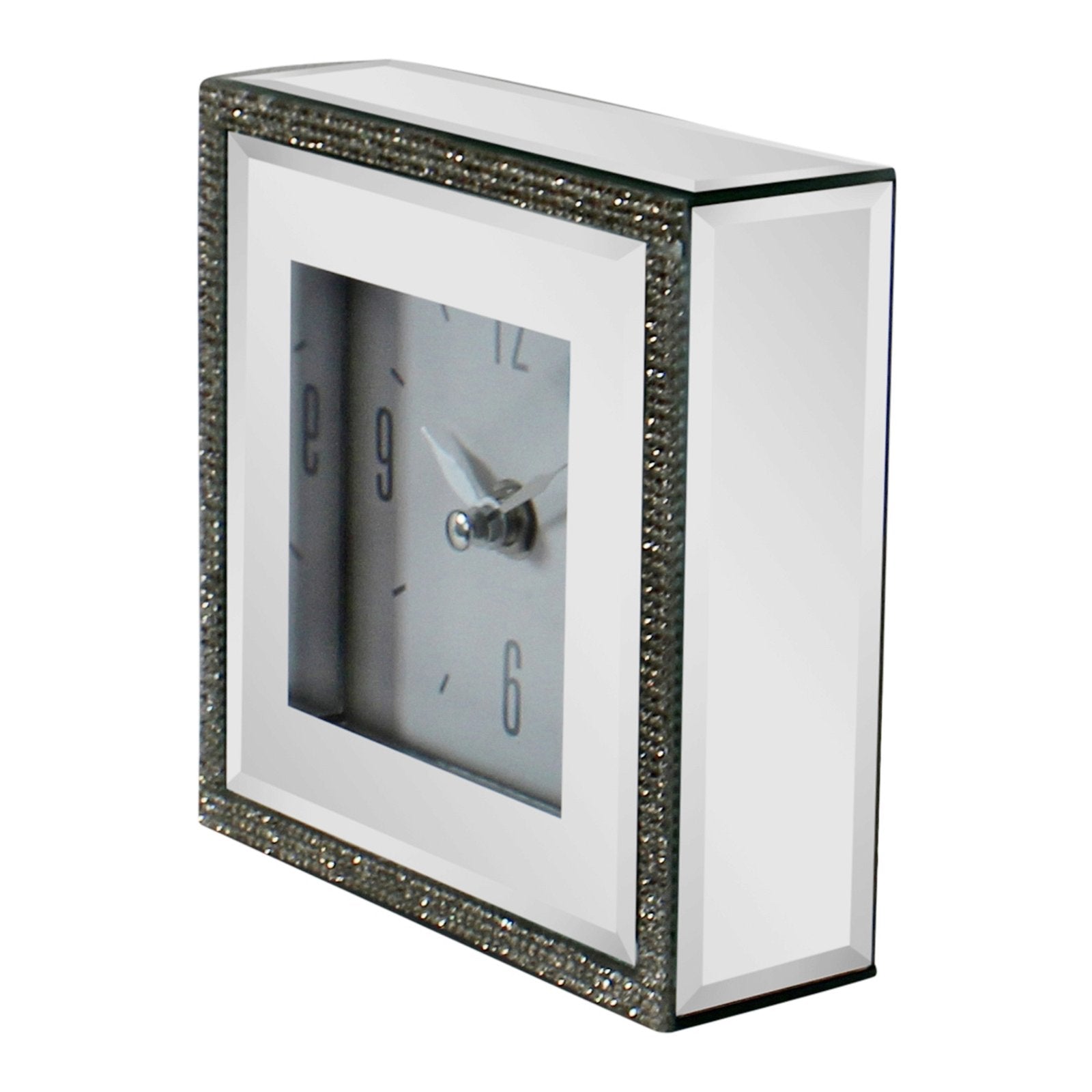 This small table clock has a mirrored frame with jewel embellishments. The clock face is white with silver hands. Beautiful, small clock perfect for a side table or mantelpiece. Made of mirrored glass with an MDF backing covered in black felt. Clock requires 1 x AA battery (not included). Measurements: D5 x H14 x W14cm