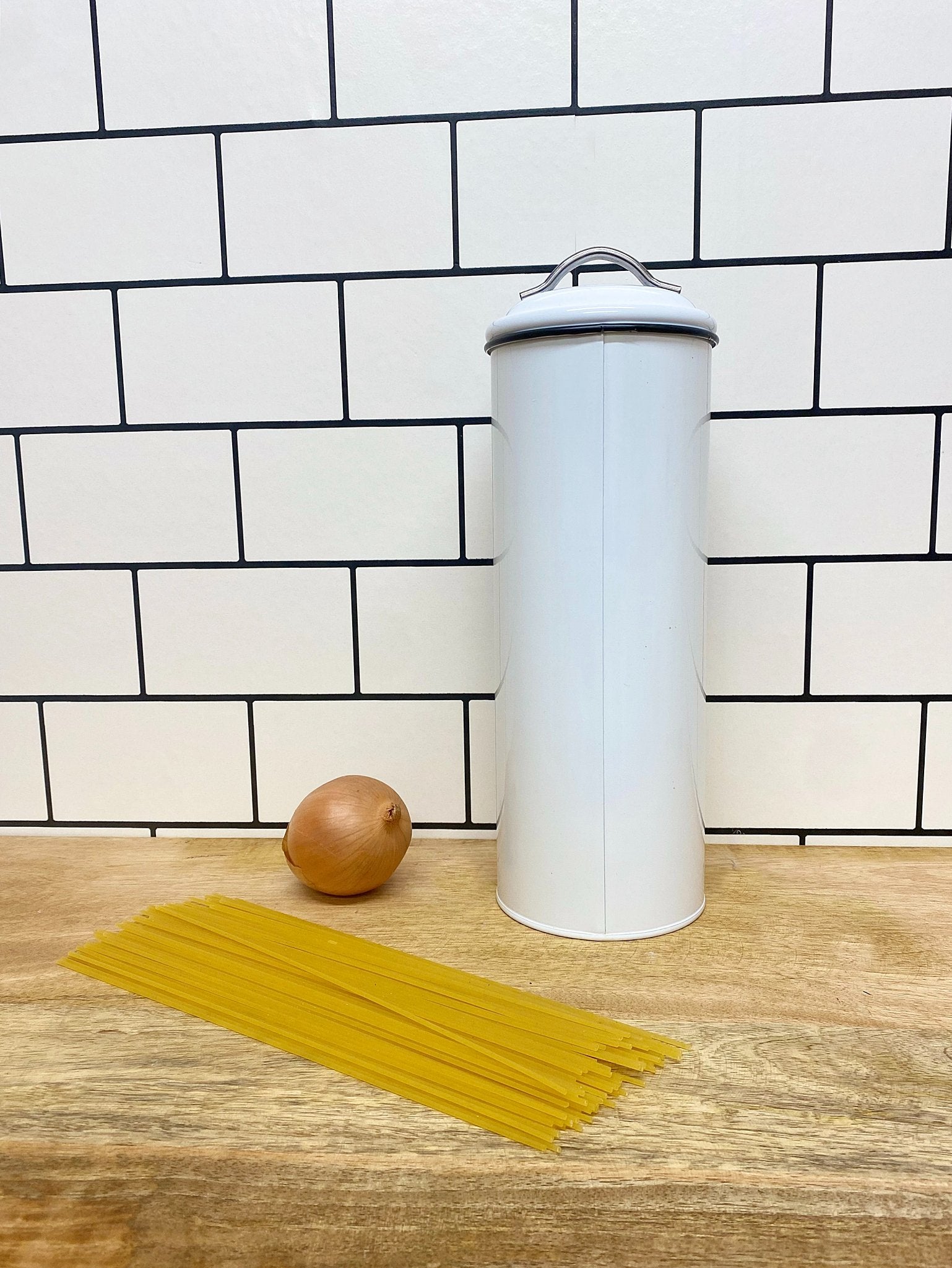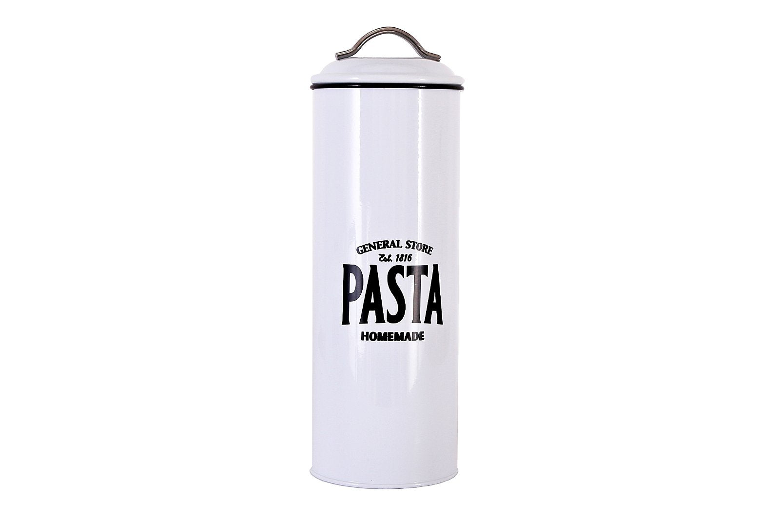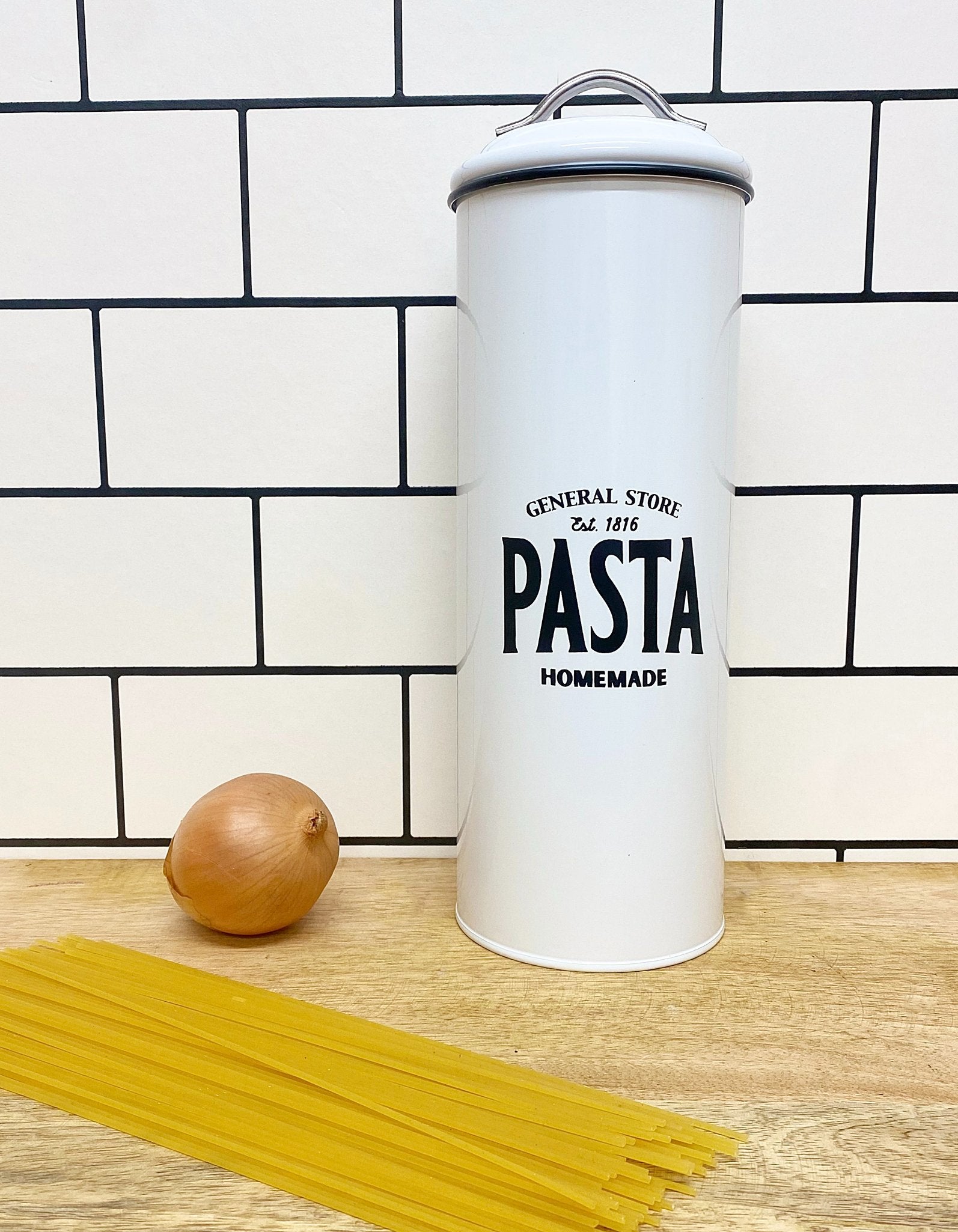 A tall metal pasta canister in a white and black colourway with a lid. With the words 'GENERAL STORE EST 1816 PASTA HOMEMADE' in black on the front. A stylish yet practical addition to any kitchen decor. A part of the General Store collection. Measurements: D11.5 x H32 x W11.5cm